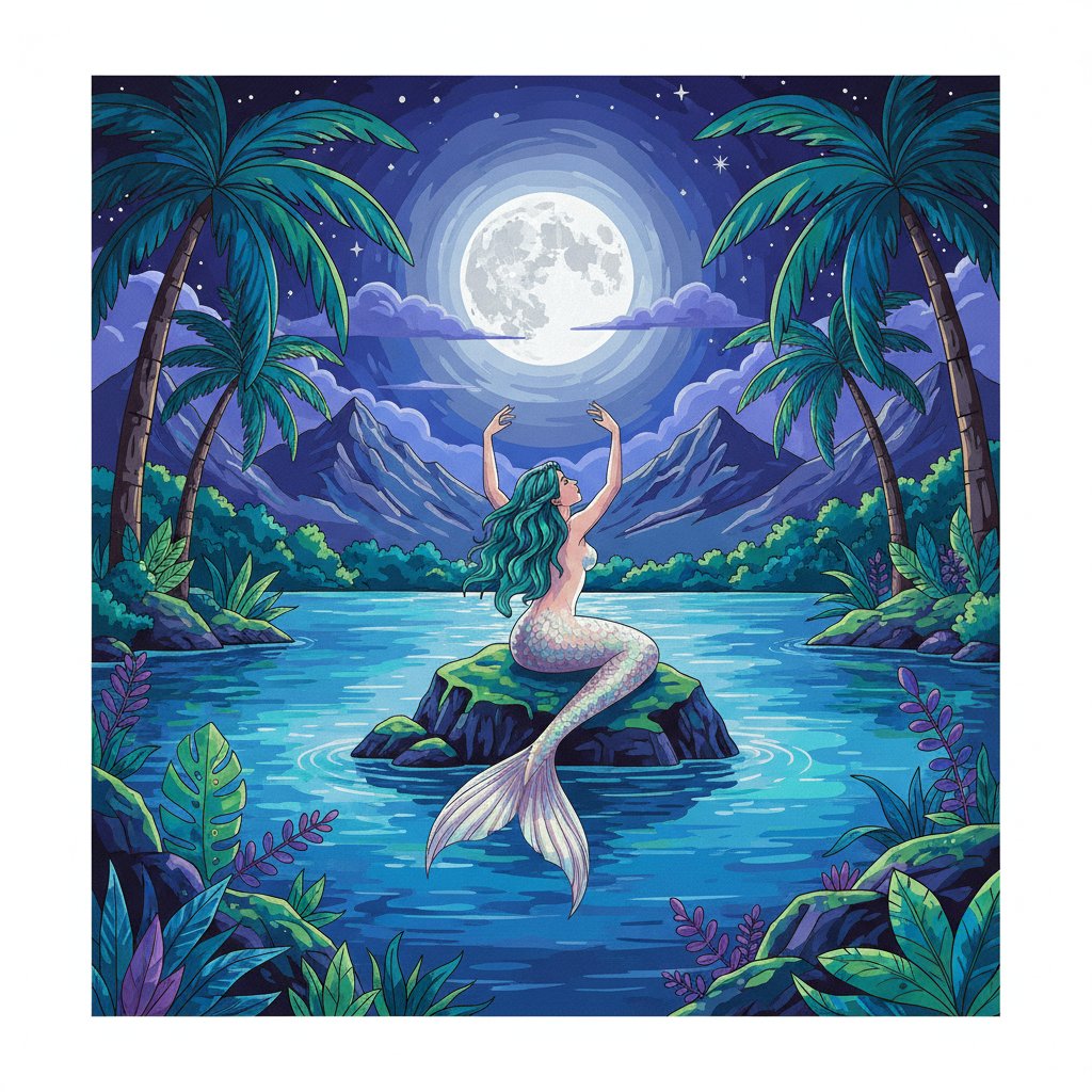 Ultimately, step back and admire your completed masterpiece. Therefore, your tropical siren artwork radiates moonlit magic. Finally, display your creation proudly in any room.