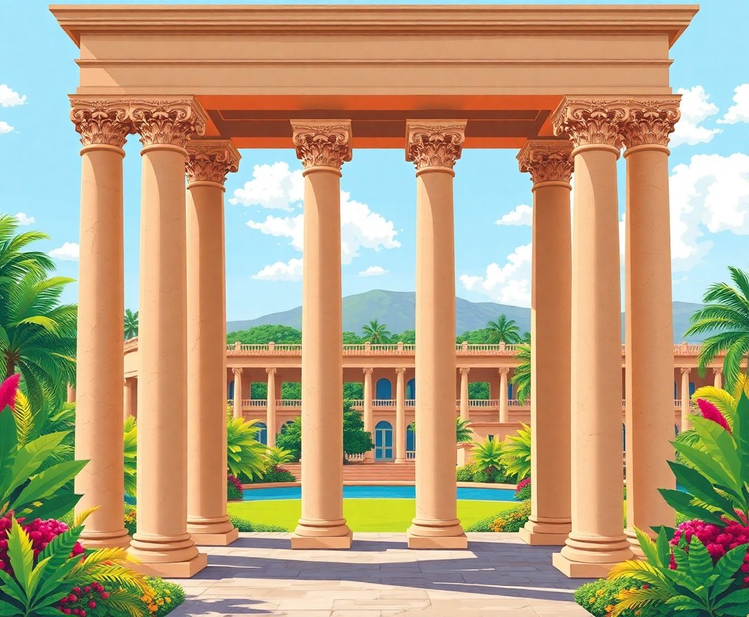 Ultimately, add the final touches of tropical greenery surrounding the columns. Watch as your masterpiece comes alive with realistic textures. Moreover, the overgrown vines create stunning contrast against weathered stone.