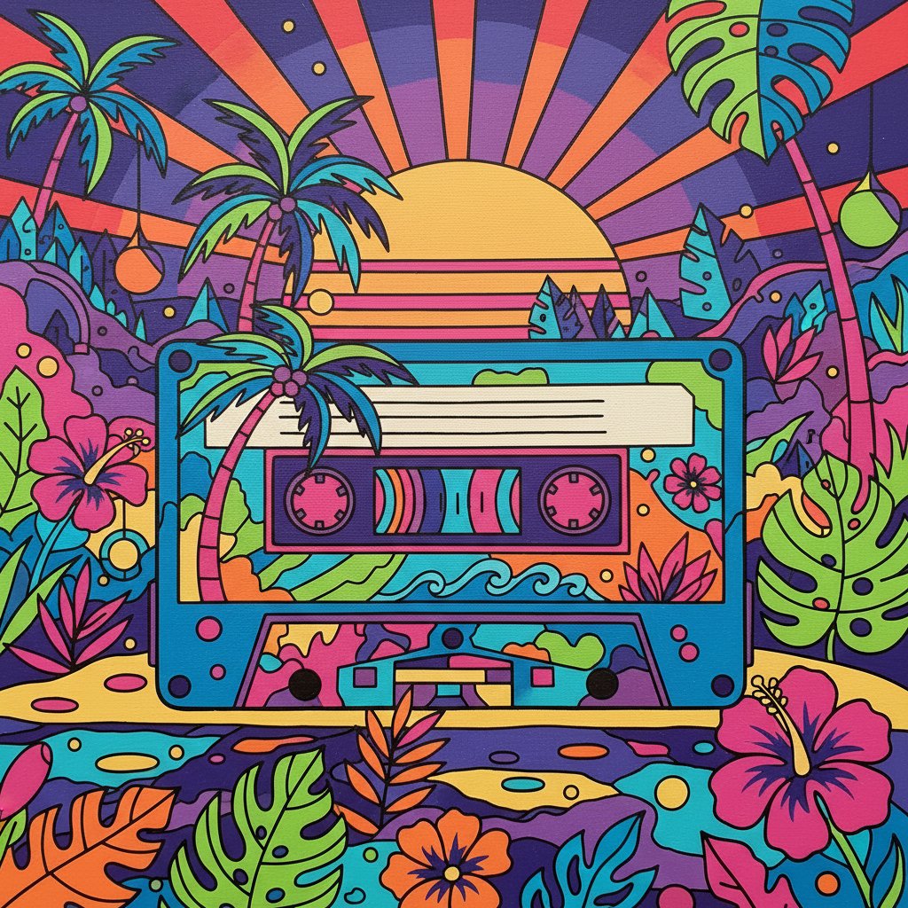 Ultimately, step back and admire your completed masterpiece. The vibrant neon colors and tropical cassette design create a stunning focal point. Frame your finished artwork for lasting enjoyment.