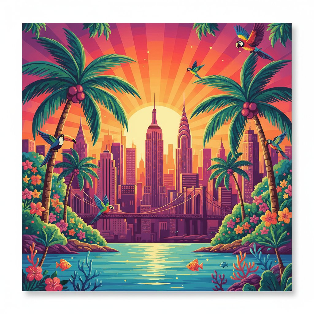 Transform your creative space with this stunning Tropical New York Glow Paint By Numbers kit. This captivating design merges the iconic Manhattan skyline with warm tropical hues. Moreover, it creates a unique artistic experience that celebrates both urban landmarks and paradise vibes.