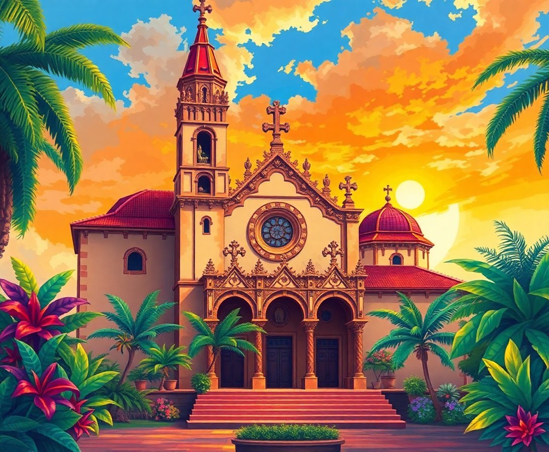 Ultimately, add finishing touches to tropical foliage surrounding the cathedral structure. These final elements complete your vintage masterpiece. Moreover, the finished artwork showcases breathtaking architectural beauty perfect for any living space.