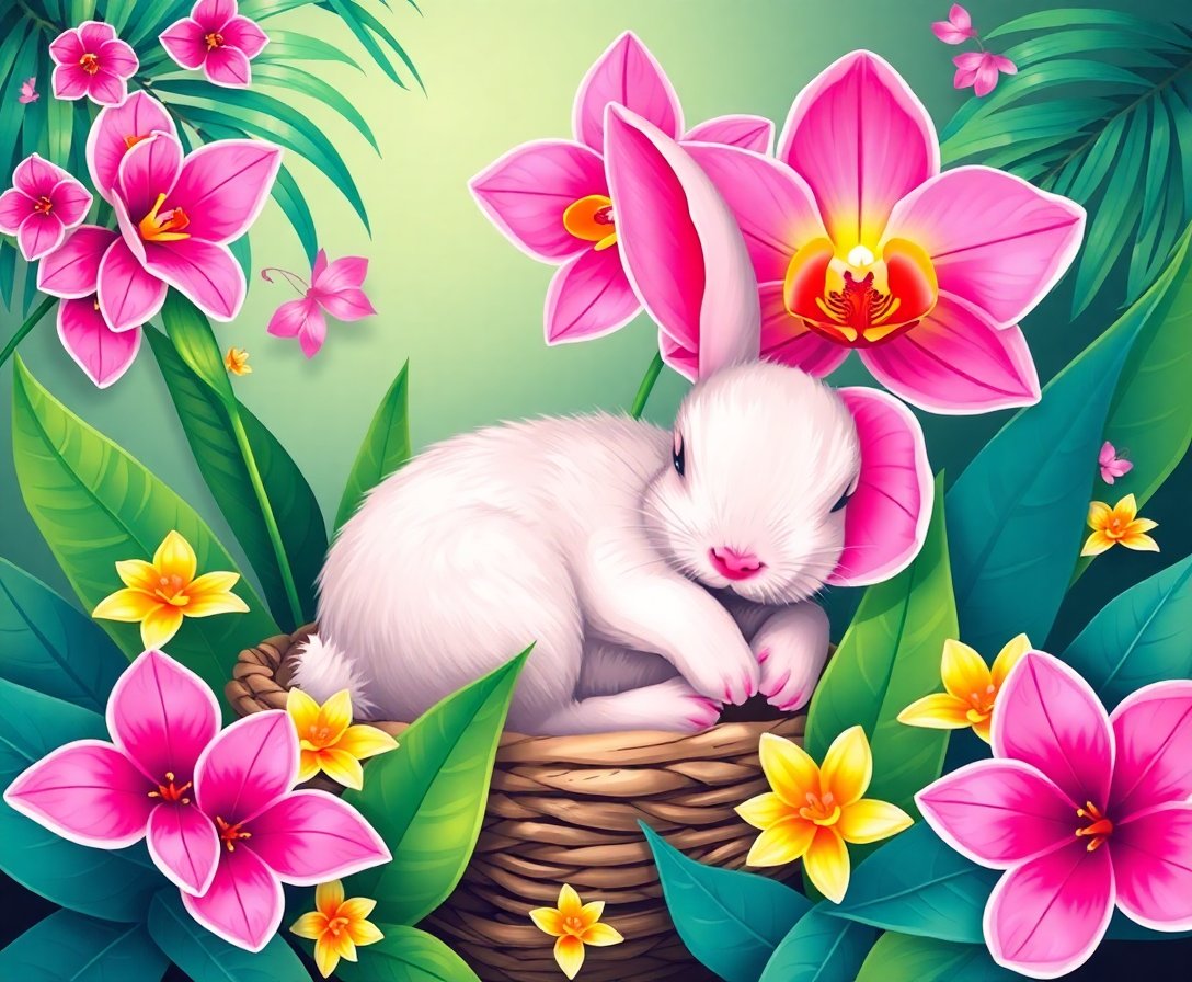 Ultimately, step back and admire your completed tropical paradise. Indeed, the realistic bunny surrounded by orchid blooms creates a stunning focal point. Your artistic achievement deserves prominent display.