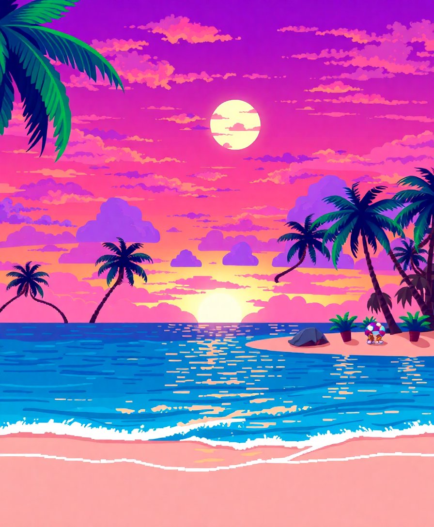 The unique pixel art style combines retro gaming nostalgia with tropical themes, creating a distinctive synthwave aesthetic that appeals to both art and gaming enthusiasts.