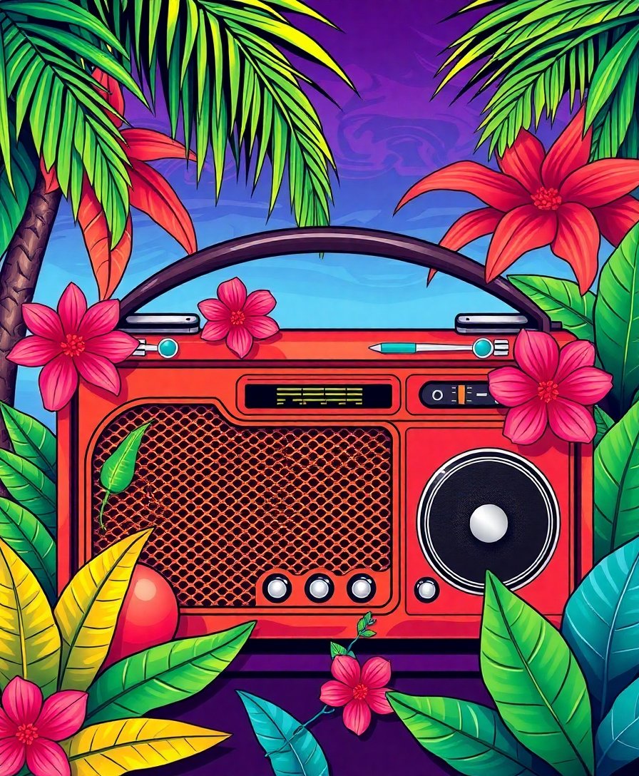 This design stands out with its unique combination of tropical aesthetics and vintage radio charm. The bold colors create eye-catching wall art perfect for any modern home. Furthermore, the advertisement theme adds sophisticated pop culture appeal. Quality materials ensure lasting results that impress guests and family members alike.