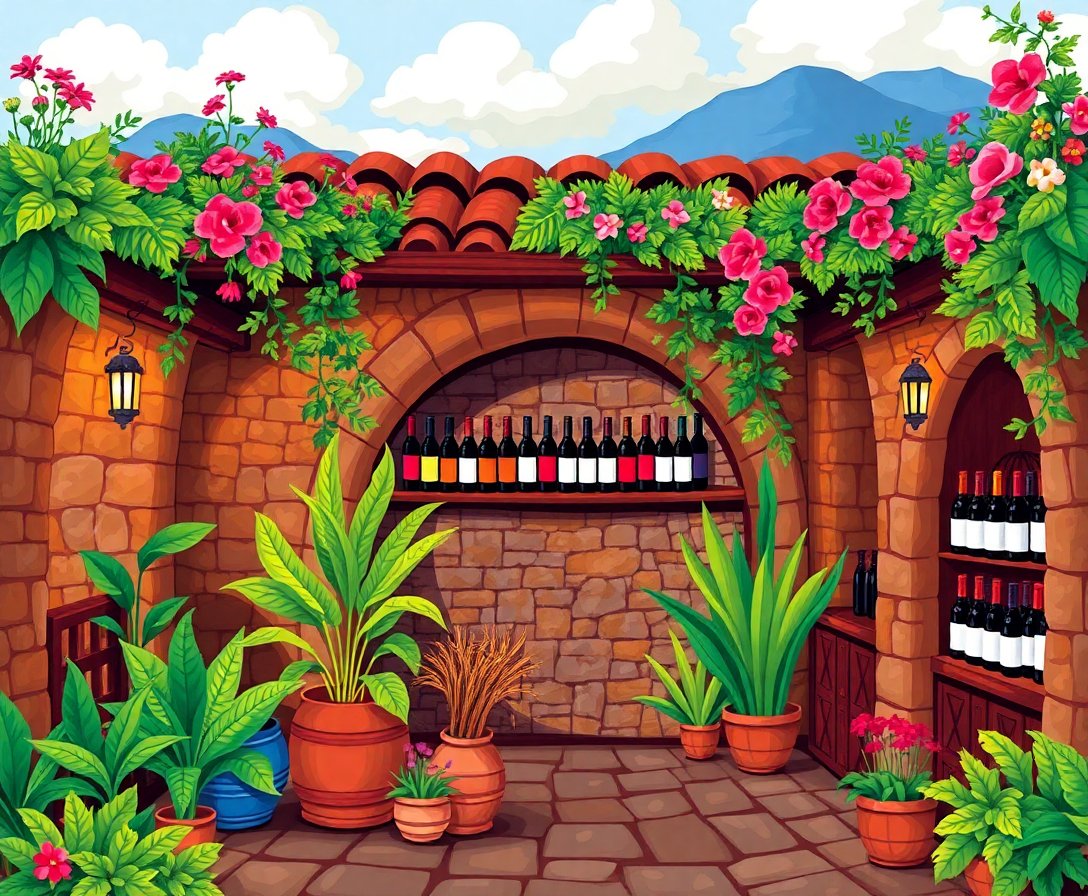 Ultimately, add final details with your smallest brush for precision work. Step back frequently to admire your progress. Your cozy tropical wine cellar scene will emerge beautifully with each careful stroke.