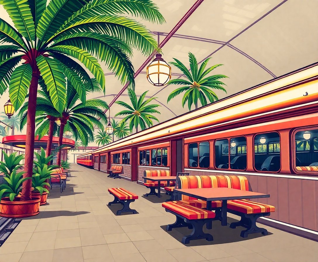 Ultimately, step back and admire your completed masterpiece. The humid tropical atmosphere and colonial charm shine through your dedication. Your finished artwork captures the nostalgic beauty of vintage railway architecture.