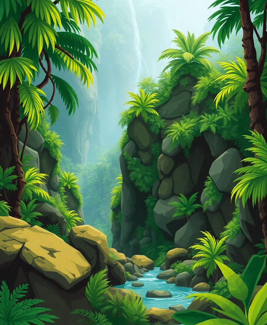 Embark on your prehistoric painting adventure today. Let this tropical ravine transport you to a world where ancient fossils tell stories among living ferns.