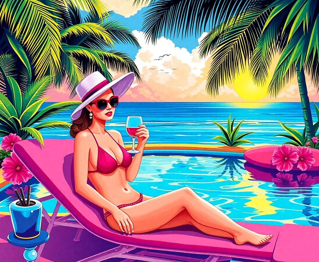 The canvas dimensions provide an ideal size for prominent wall display while maintaining intricate detail clarity throughout the tropical poolside scene.