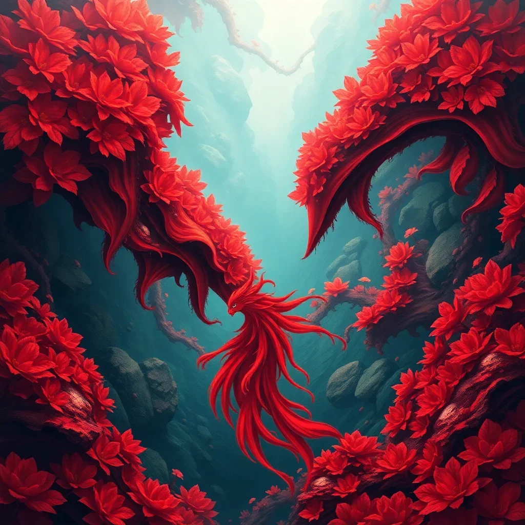 Ultimately, step back and admire your completed tropical masterpiece. The flowing red tones against oceanic blues create a stunning visual impact that transforms any room into a coastal paradise.