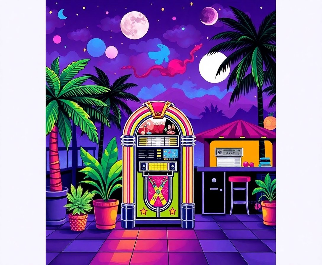 This unique design combines classic diner jukebox nostalgia with tropical midnight vibes. The magenta and palm tree elements create stunning visual contrast perfect for any retro-themed space.