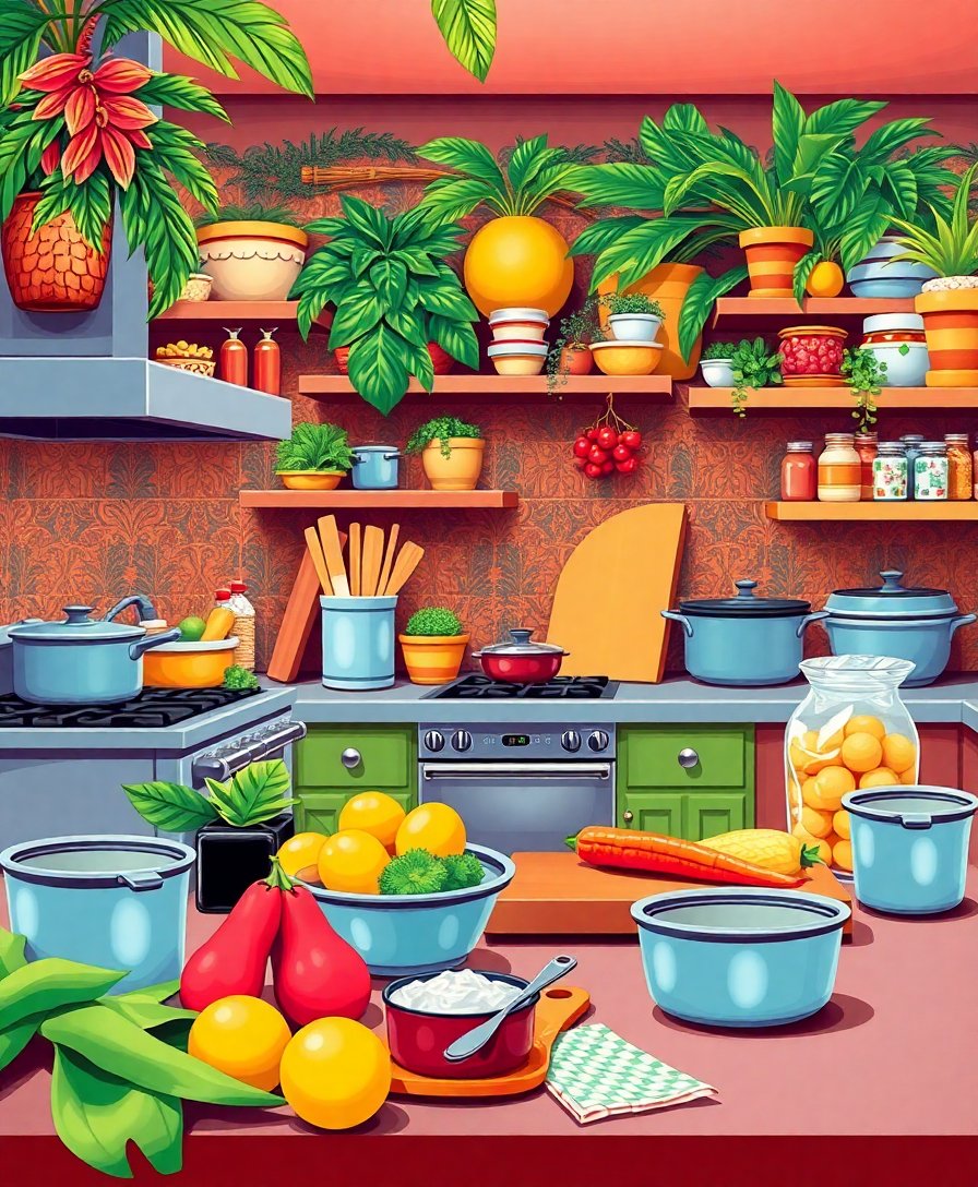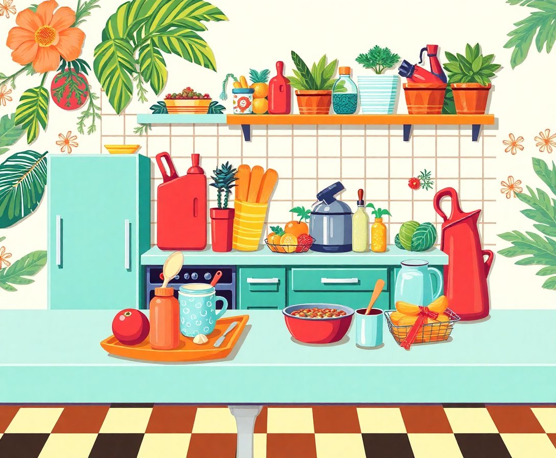 Transform your space with this charming Tropical Retro Kitchen Prep Paint By Numbers kit. This delightful design captures the nostalgic essence of mid-century kitchen charm. Additionally, vibrant tropical elements blend seamlessly with retro appliances and cozy pastel tones.