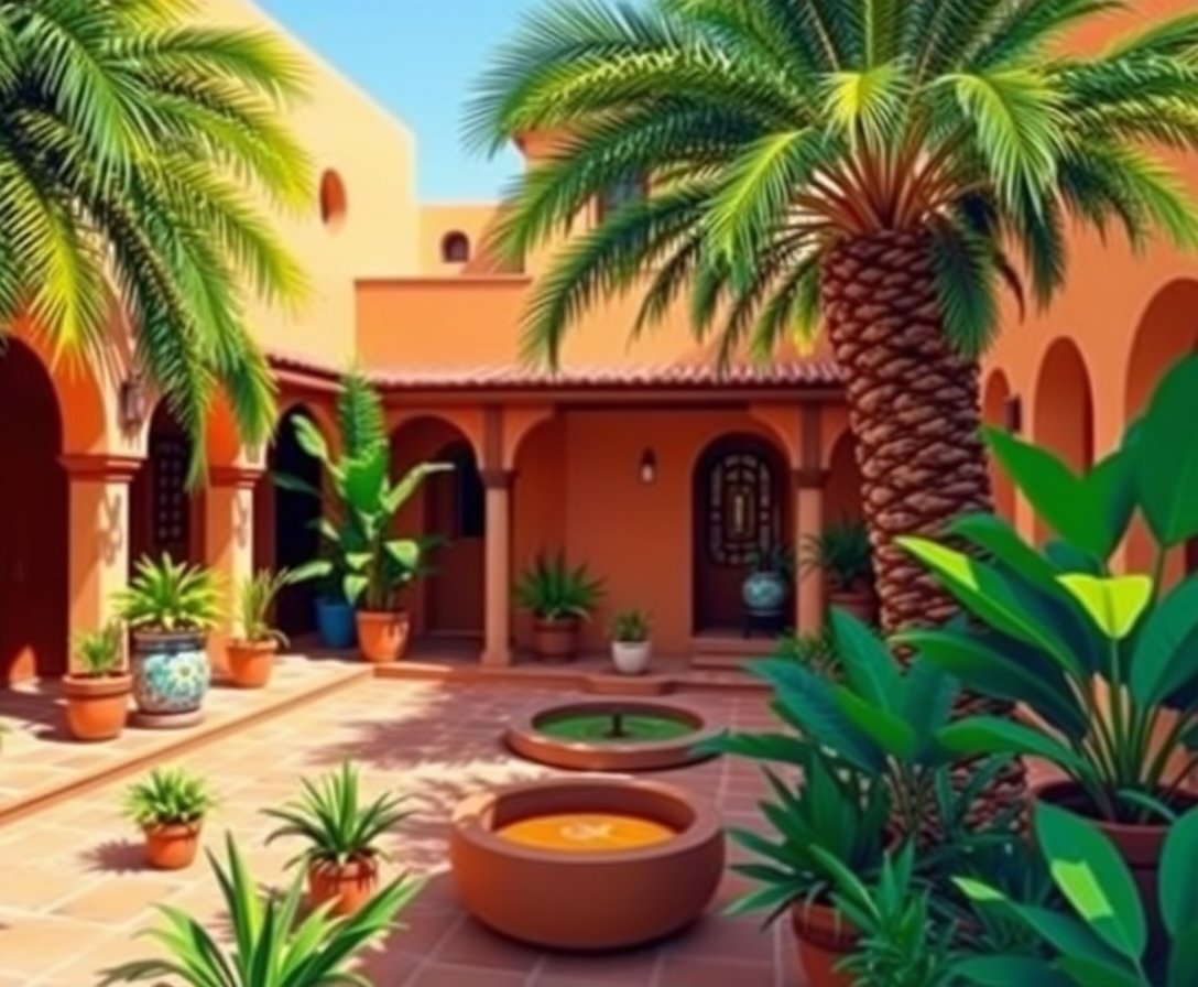 This design captures authentic Moroccan riad architecture with beautiful fountain details, intricate tilework patterns, and lush botanical elements. The serene composition creates a peaceful focal point for any room.