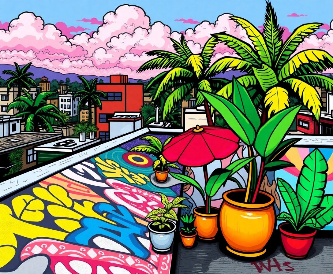 Ultimately, step back to admire your finished tropical rooftop masterpiece bursting with vibrant colors. Therefore, the final result showcases bold graffiti elements harmoniously blended with lush tropical motifs across the urban landscape.