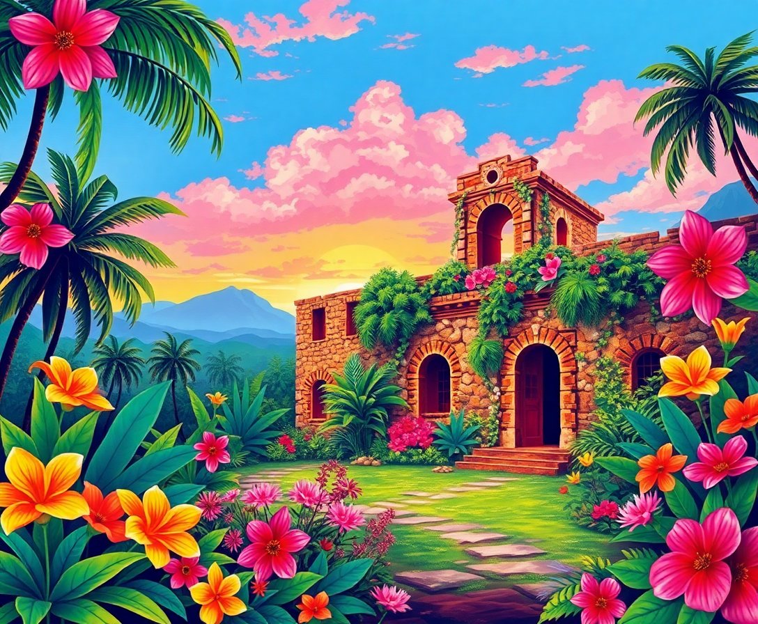 Transform ancient ruins into vibrant tropical paradise with the Tropical Route Floral Ruins Paint By Numbers kit. This captivating design blends nostalgia with nature’s reclamation power. Flora bursts through weathered stone structures. Meanwhile, tropical elements create stunning visual contrast against historical ruins.