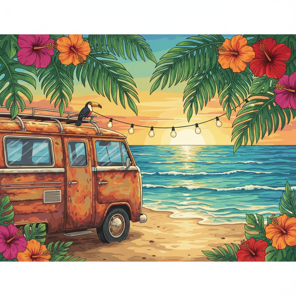 Transform your space with vibrant urban artistry through this Tropical Rust Camper Mural Paint By Numbers. This captivating design blends tropical paradise with gritty street aesthetics. Additionally, the weathered camper van tells a story of adventure and wanderlust.