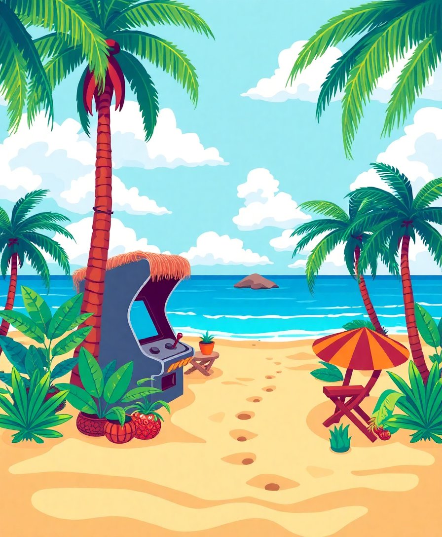 Ultimately, step back and admire your completed tropical gaming masterpiece with pride. Furthermore, the sunset hues create a mesmerizing backdrop for display. Your artistic achievement captures both nostalgia and tropical serenity perfectly.