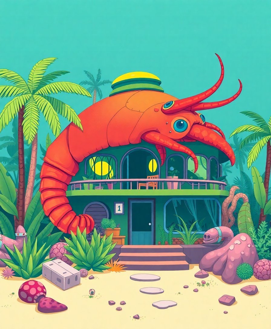 Ultimately, step back and admire your completed masterpiece as the final details bring the scene to life. The realistic hermit crabs nestled within their futuristic habitat create a conversation piece that perfectly captures mid-century sci-fi charm and wonder.