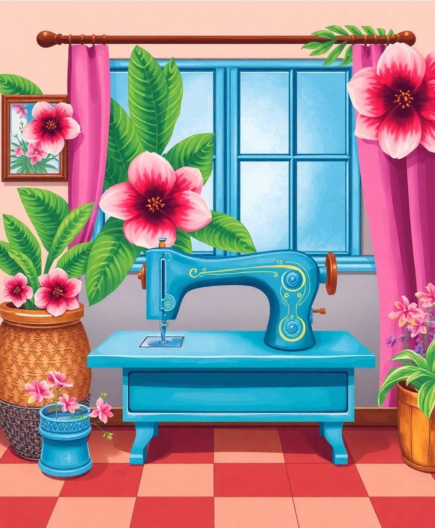 Transform your creative space with the enchanting Tropical Sewing Room Bloom Paint By Numbers. This distinctive kit captures the serene beauty of a heritage sewing room adorned with vibrant tropical botanicals. Moreover, the warm mahogany tones blend seamlessly with lush tropical blooms.