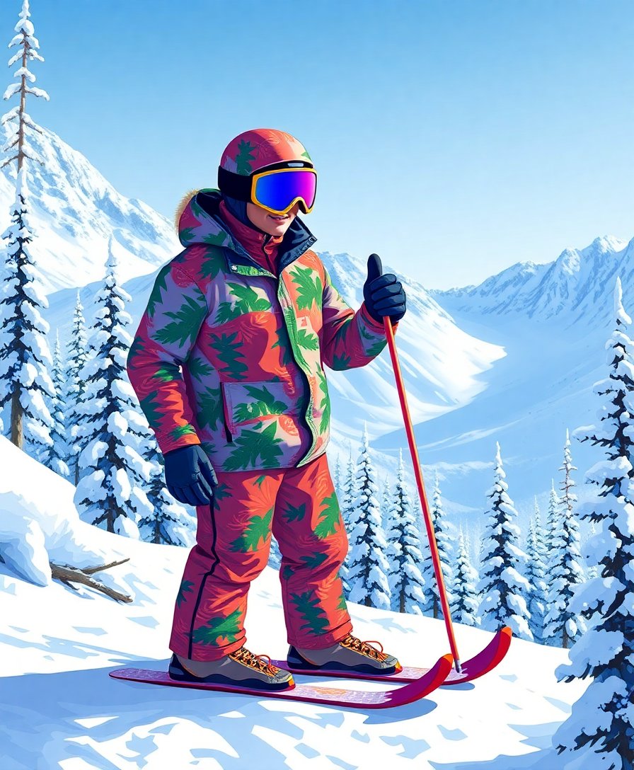 This unique artwork combines nostalgic ski suit aesthetics with tropical elements, creating a distinctive vintage-modern blend that stands out beautifully in any room.