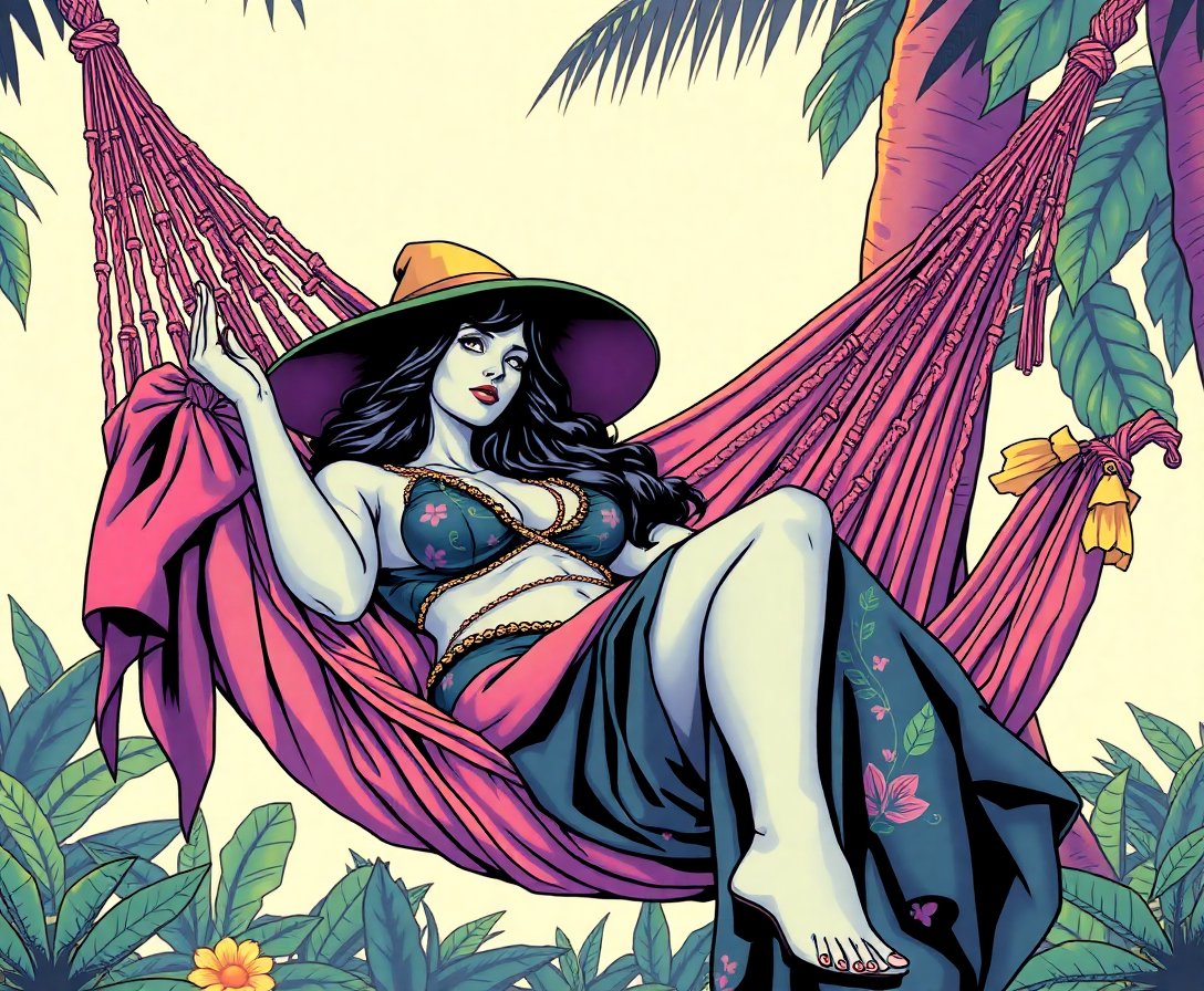 Ultimately, add final details and touch-ups to complete your tropical masterpiece. Allow the painting to dry completely before removing it from your easel. Frame your finished artwork to showcase this beautiful sorceress in her peaceful hammock setting.