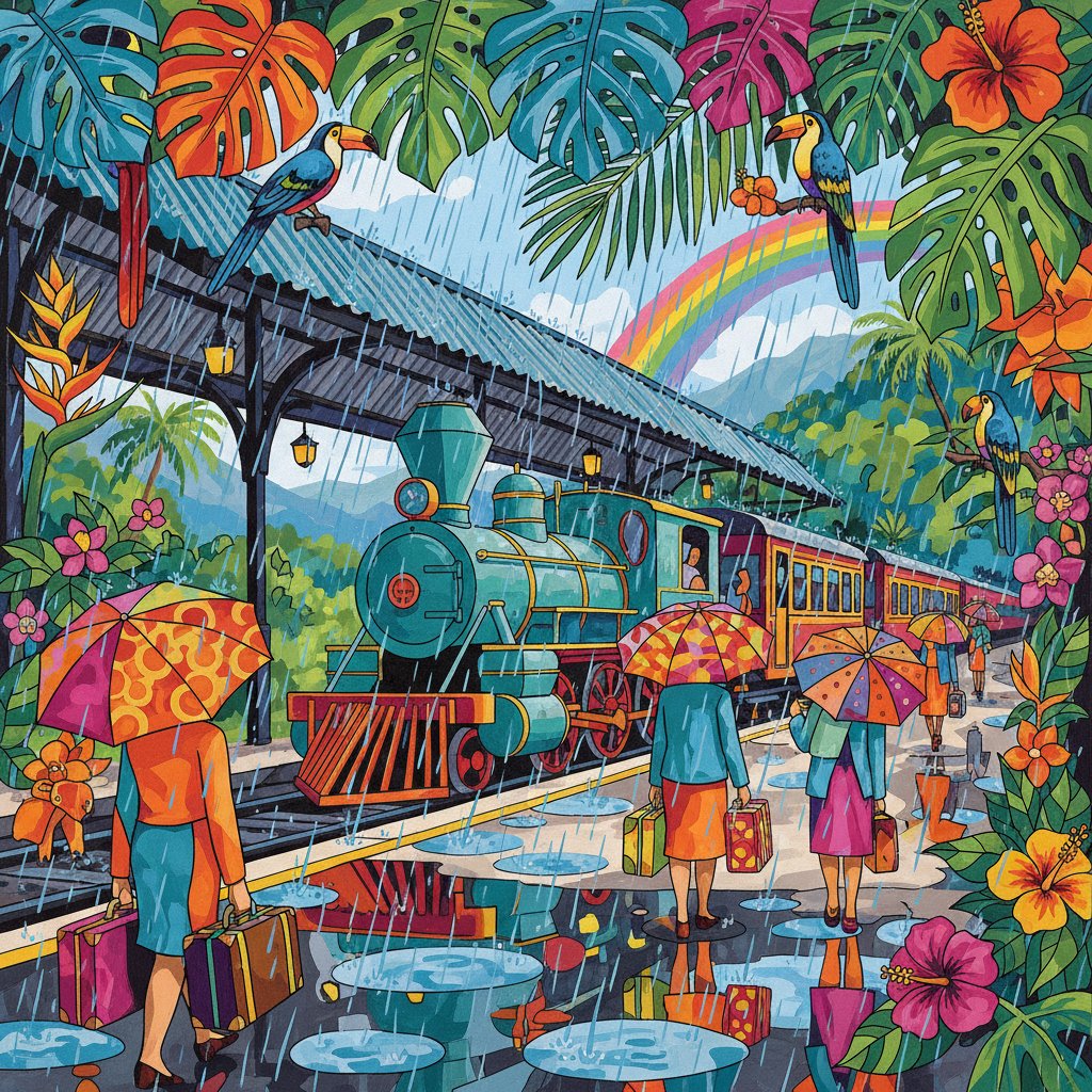 Transform rainy day creativity into an extraordinary artistic journey with this Tropical Station Downpour Paint By Numbers masterpiece. This captivating railway scene captures the dramatic beauty of monsoon rains cascading over vintage architectural elements. Additionally, the realistic details invite you to explore every weathered surface and atmospheric element.