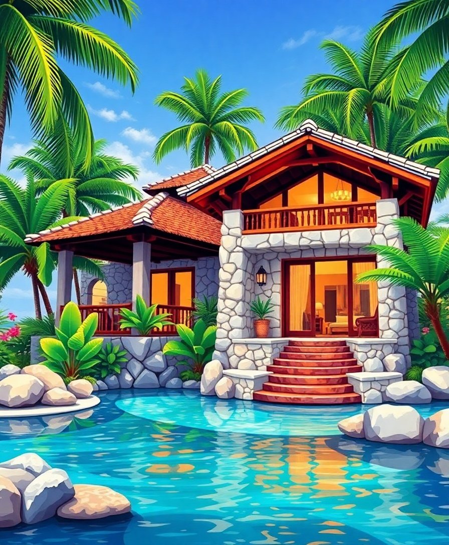 Transform your space into a tropical paradise with this stunning Tropical Stone Resort Villa Paint By Numbers masterpiece. This exquisite kit captures the serene beauty of luxury resort architecture nestled among swaying palms and crystal-clear waters. Experience the joy of creating your own vacation-inspired artwork from home.