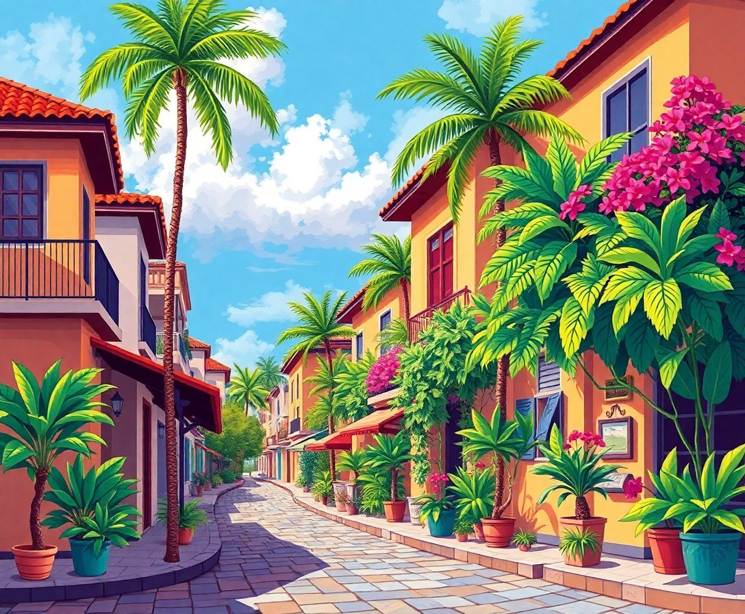 Create your own slice of paradise with this captivating paint by numbers kit. Moreover, this tropical street scene brings warmth and personality to any space beautifully.