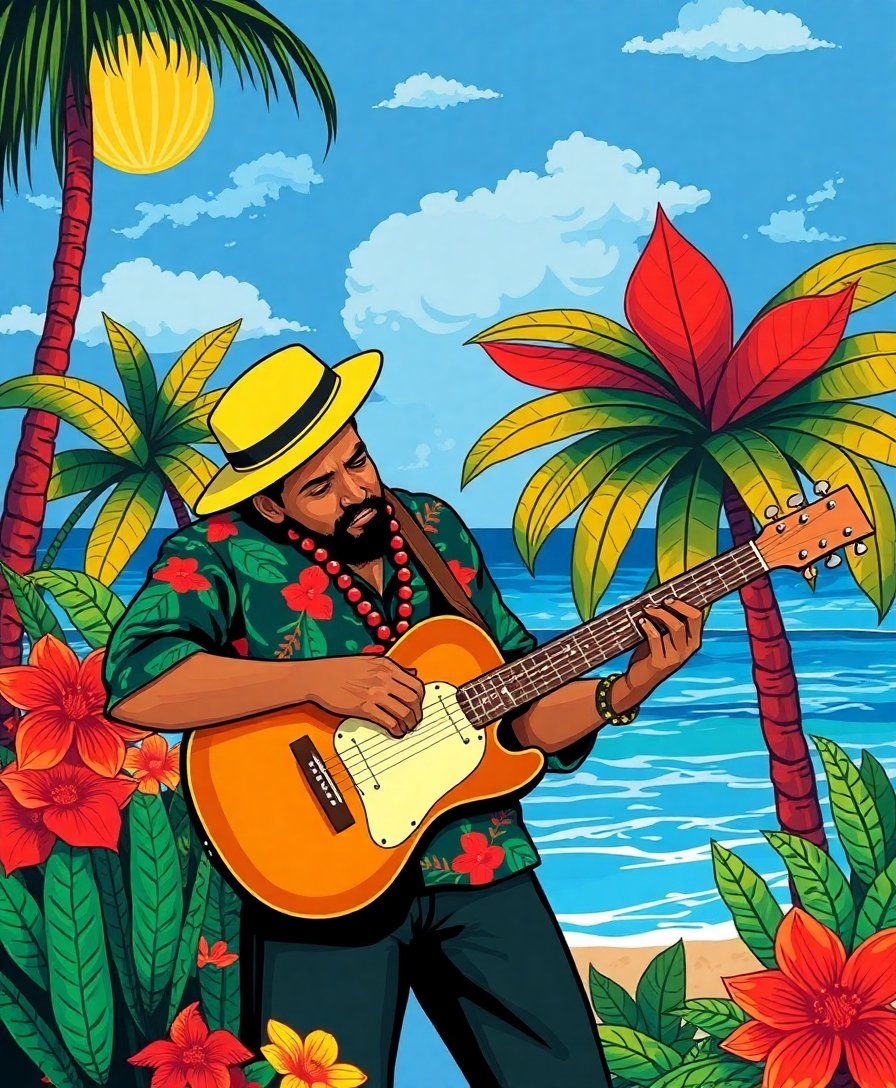 The vibrant seaside concert theme combines musical nostalgia with tropical paradise imagery. This unique blend creates an engaging artistic experience that appeals to both music and art lovers.
