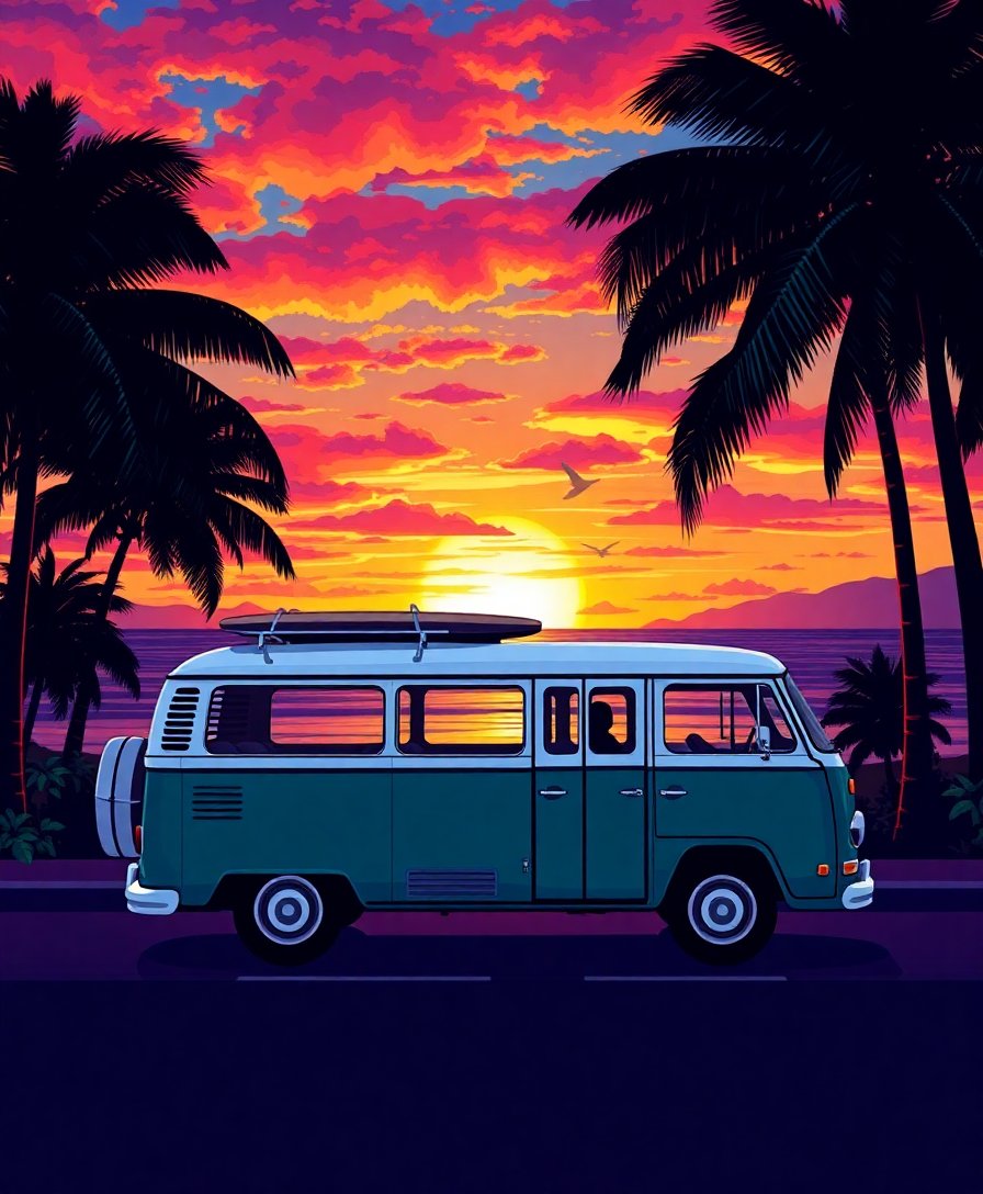 Transform your creative space with this stunning Tropical Surf Bus Dusk Paint By Numbers masterpiece. This breathtaking design captures the essence of retro coastal living. Furthermore, warm sunset tones blend seamlessly with tropical palm silhouettes. Additionally, the iconic surf bus creates a nostalgic focal point against the horizon.