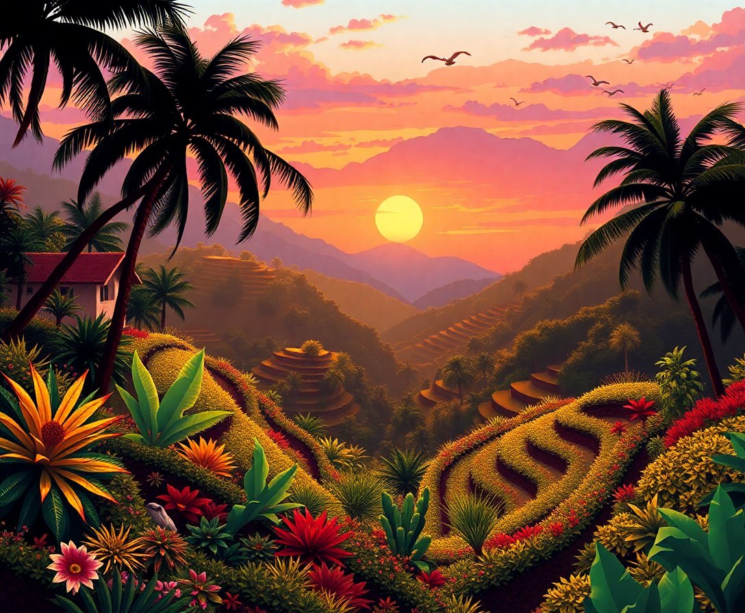 Ultimately, step back and admire your finished masterpiece hanging proudly on your wall. Consequently, the tropical terraced landscape radiates warmth and accomplishment throughout your space. Moreover, friends and family will marvel at your artistic achievement.