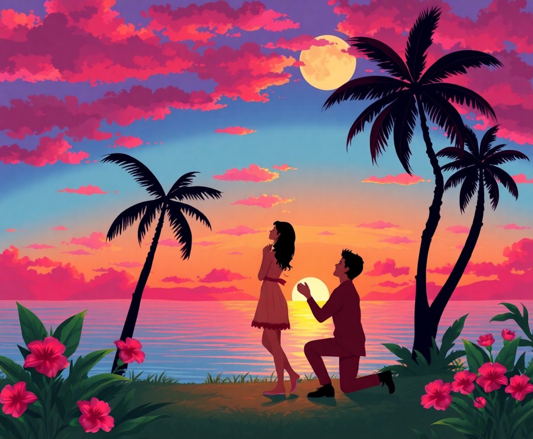Ultimately, add final touches to silhouettes and highlights. Step back frequently to assess your progress. Your romantic tropical scene will emerge beautifully. The finished piece radiates warmth and captures proposal magic perfectly.