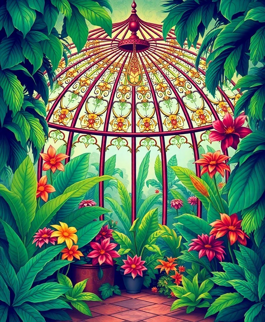 Ultimately, step back and admire your completed conservatory scene. Additionally, the tropical foliage and ornate dome details create a sophisticated focal point for any room.