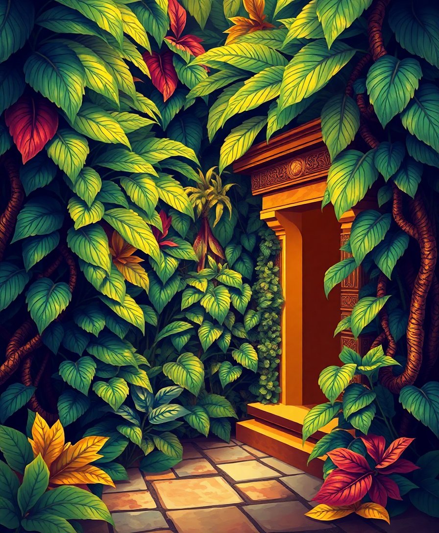 Ultimately, add the finest details to complete your masterpiece. Step back frequently to appreciate how the tropical overgrowth reveals hidden golden treasures beneath. Your finished artwork captures both nature’s power and humanity’s ancient legacy.