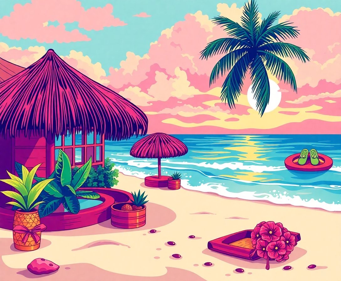 Embrace the nostalgic charm of beach culture through this engaging artistic adventure. Therefore, create your own tropical paradise while celebrating the golden age of cassette culture and summer vibes.
