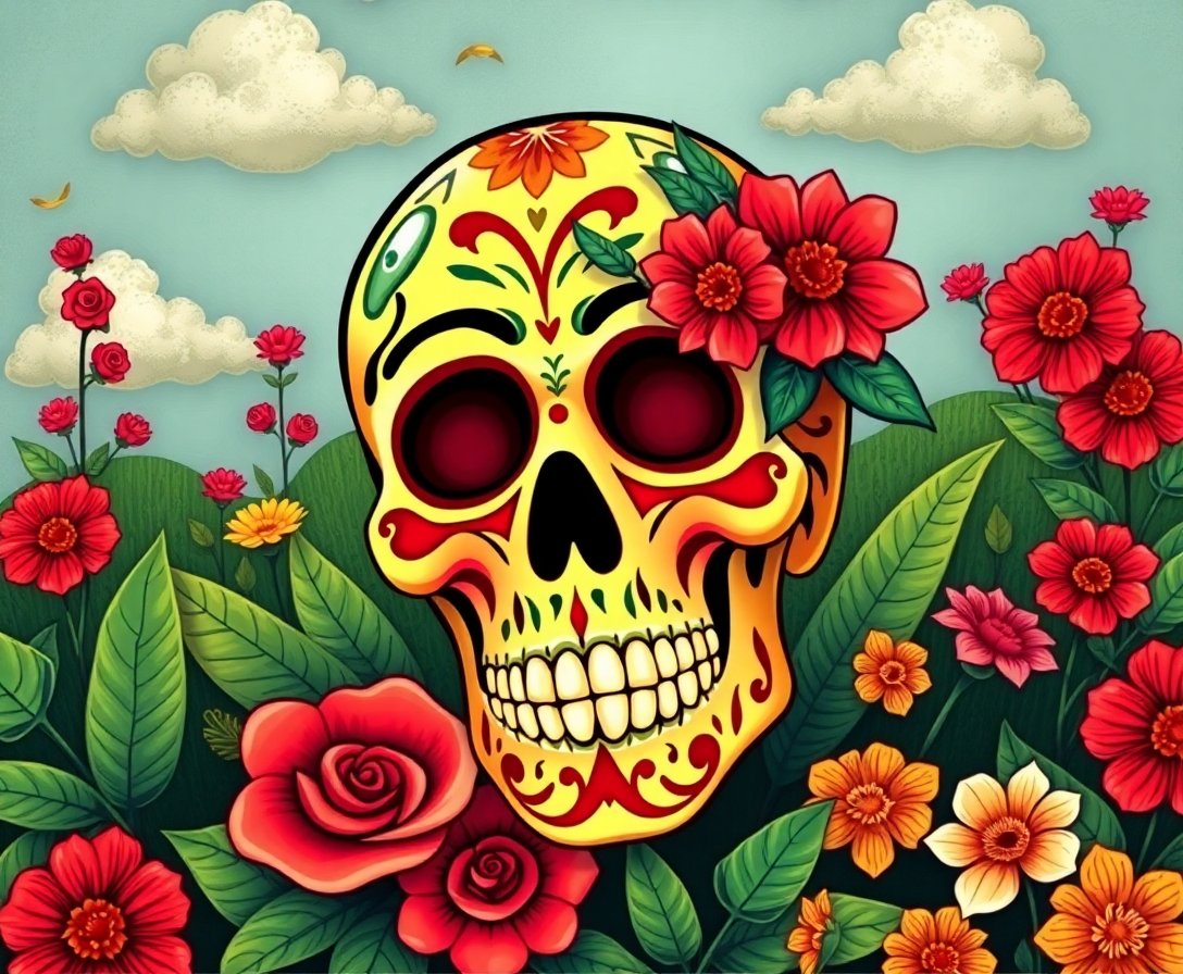Ultimately, step back and admire your finished tropical calavera masterpiece. Furthermore, the vibrant colors and intricate details create a stunning focal point. Finally, your completed artwork celebrates both artistic achievement and cultural heritage.