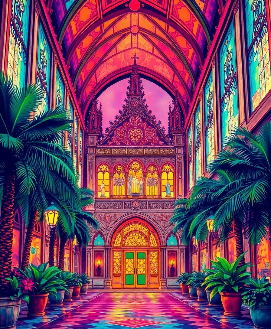 Transform your space with the mesmerizing beauty of stained glass architecture through this stunning Tropical Vintage Glass Glow Paint By Numbers kit. This unique design captures the ethereal glow of cathedral windows surrounded by lush tropical foliage, creating a captivating blend of vintage elegance and natural splendor.