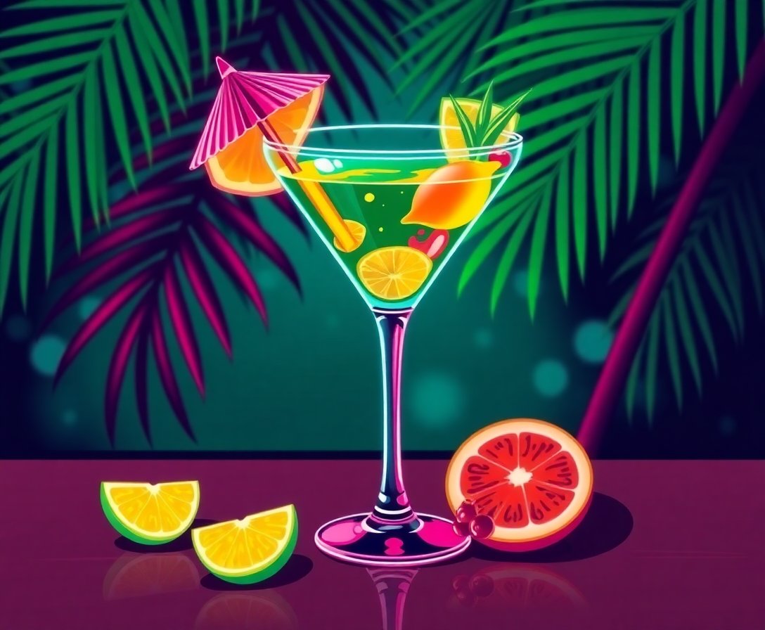 Ultimately, step back and admire your completed masterpiece. The vibrant neon martini design creates an eye-catching focal point. Your finished artwork celebrates both vintage style and tropical vibes.