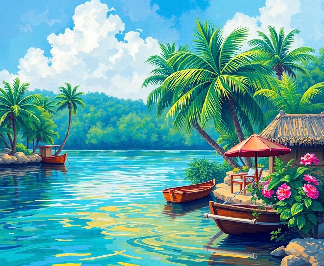 Ultimately, add final details to palm fronds and water reflections. Furthermore, these finishing touches bring your waterside retreat to life. Therefore, your completed masterpiece radiates tropical tranquility.