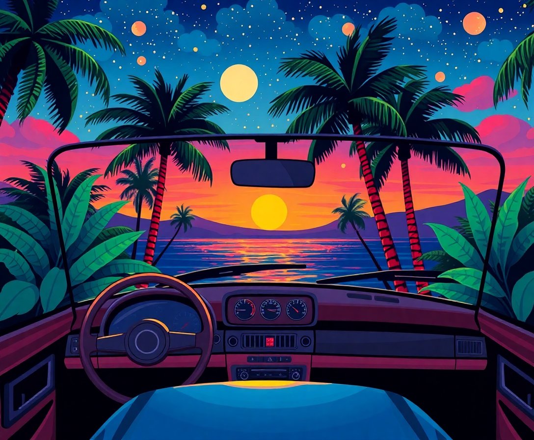 This distinctive design captures the magic of outdoor cinema experiences. The tropical setting creates warmth and escapism. Moreover, the realistic windshield perspective adds depth and immersion. Perfect for movie enthusiasts and tropical art lovers alike.