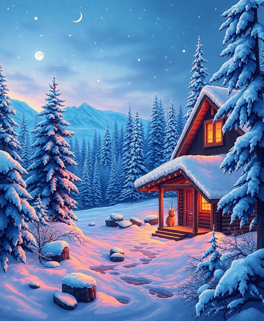 This design combines unexpected tropical elements with traditional winter cabin scenery. The warm twilight glow creates a magical atmosphere that’s both cozy and exotic.