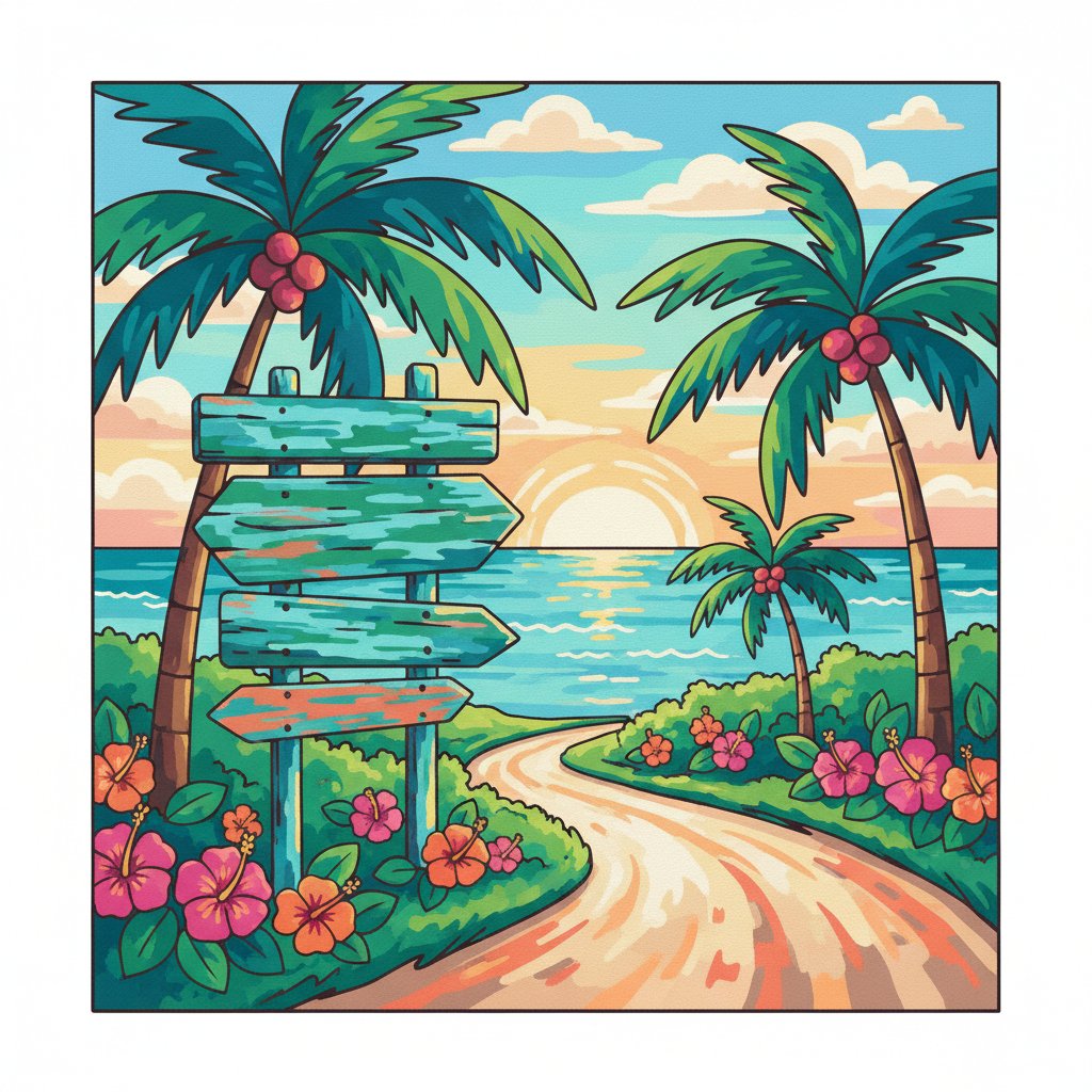 Transform your space with the vibrant charm of island life through our Turquoise Tropical Roadside Sign Paint By Numbers. This captivating design captures the essence of coastal cruiser culture and vintage advertisements. Moreover, the stunning turquoise hues will transport you to a tropical paradise.