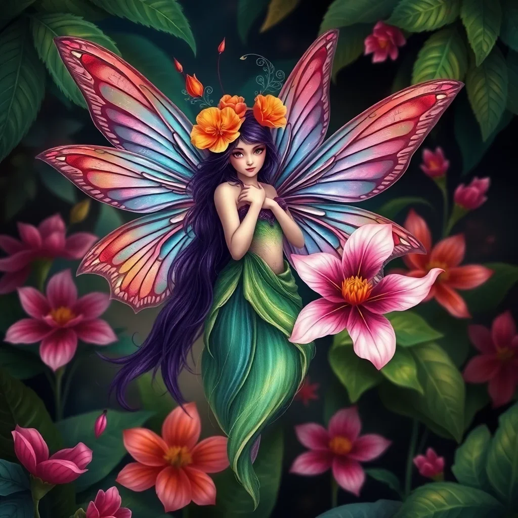 Subsequently, layer your colors gradually across the fairy’s delicate features. Watch tropical blooms emerge around her graceful form. Additionally, blend colors at edges for smooth transitions.