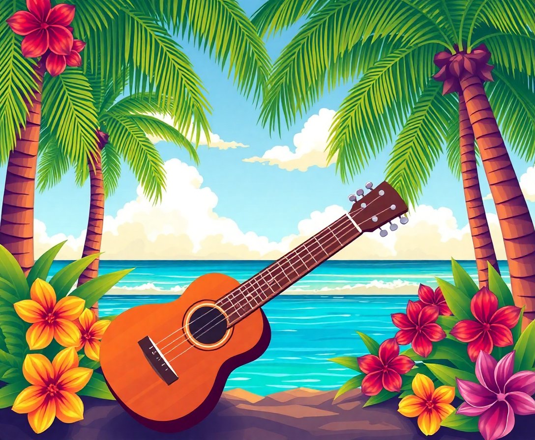Ultimately, step back and admire your finished masterpiece. The realistic details of the ukulele beneath tropical palms create a stunning festival atmosphere. Your completed artwork brings the serene shade of paradise directly to your wall.