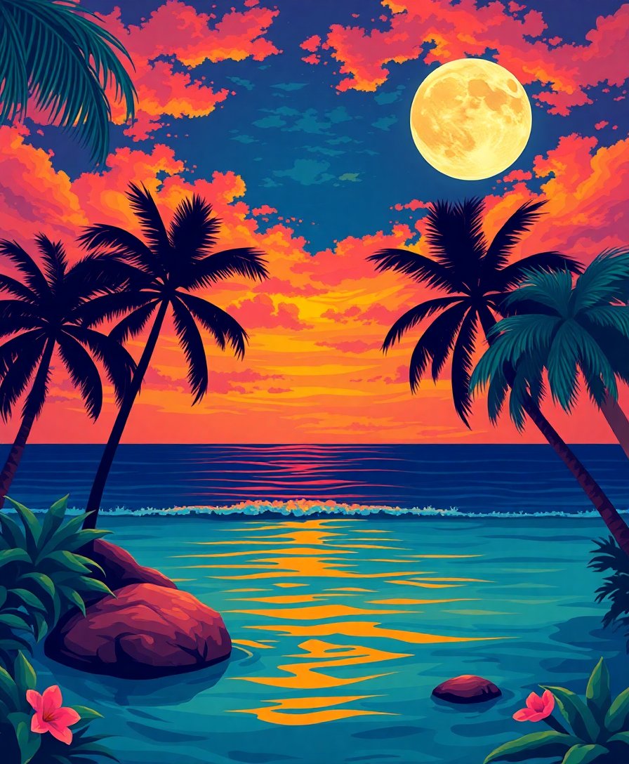 Ultimately, step back and admire your completed tropical moon scene. The dramatic interplay of colors creates a realistic pulp fiction aesthetic that commands attention. Your finished artwork ready for proud display.