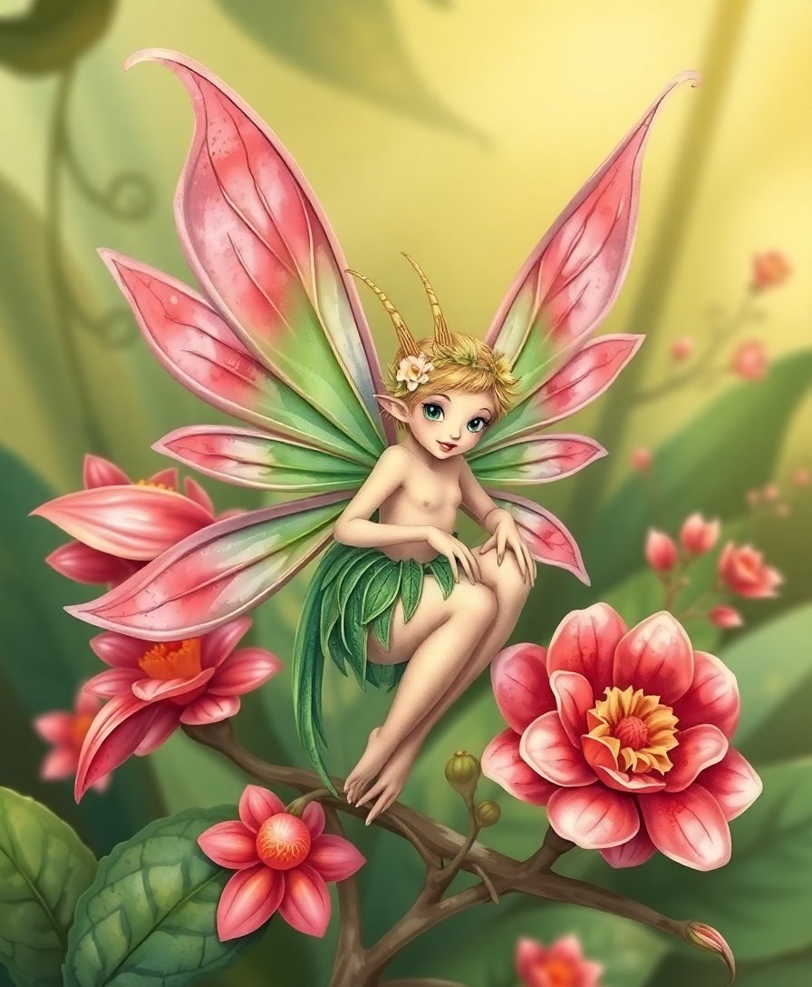 Embrace the magic of tropical artistry and let your creativity flourish. This enchanting sprite awaits your artistic touch to bring her botanical world to vivid life.