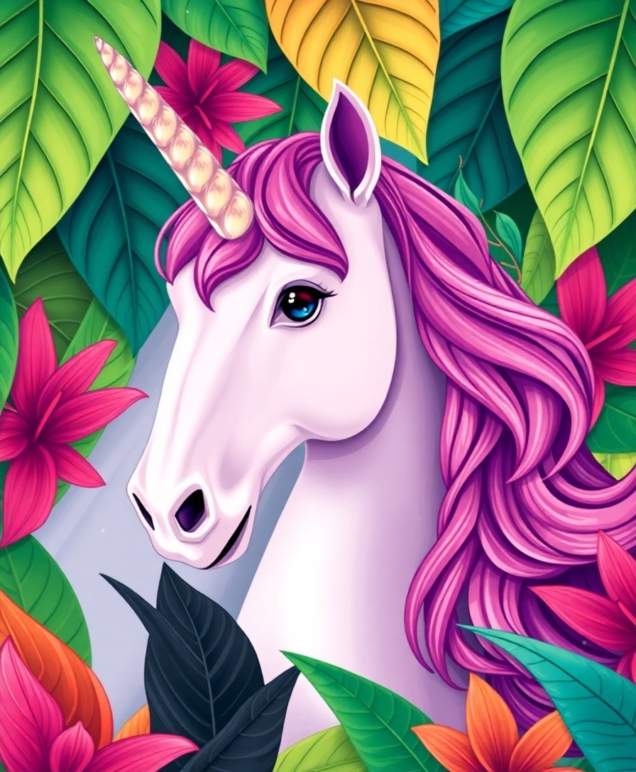 Transform your creative space with this enchanting Unicorn Beneath Tropical Leaves Paint By Numbers masterpiece. This magical design combines mythical beauty with lush tropical elements. Each brushstroke reveals stunning detail and vibrant colors.