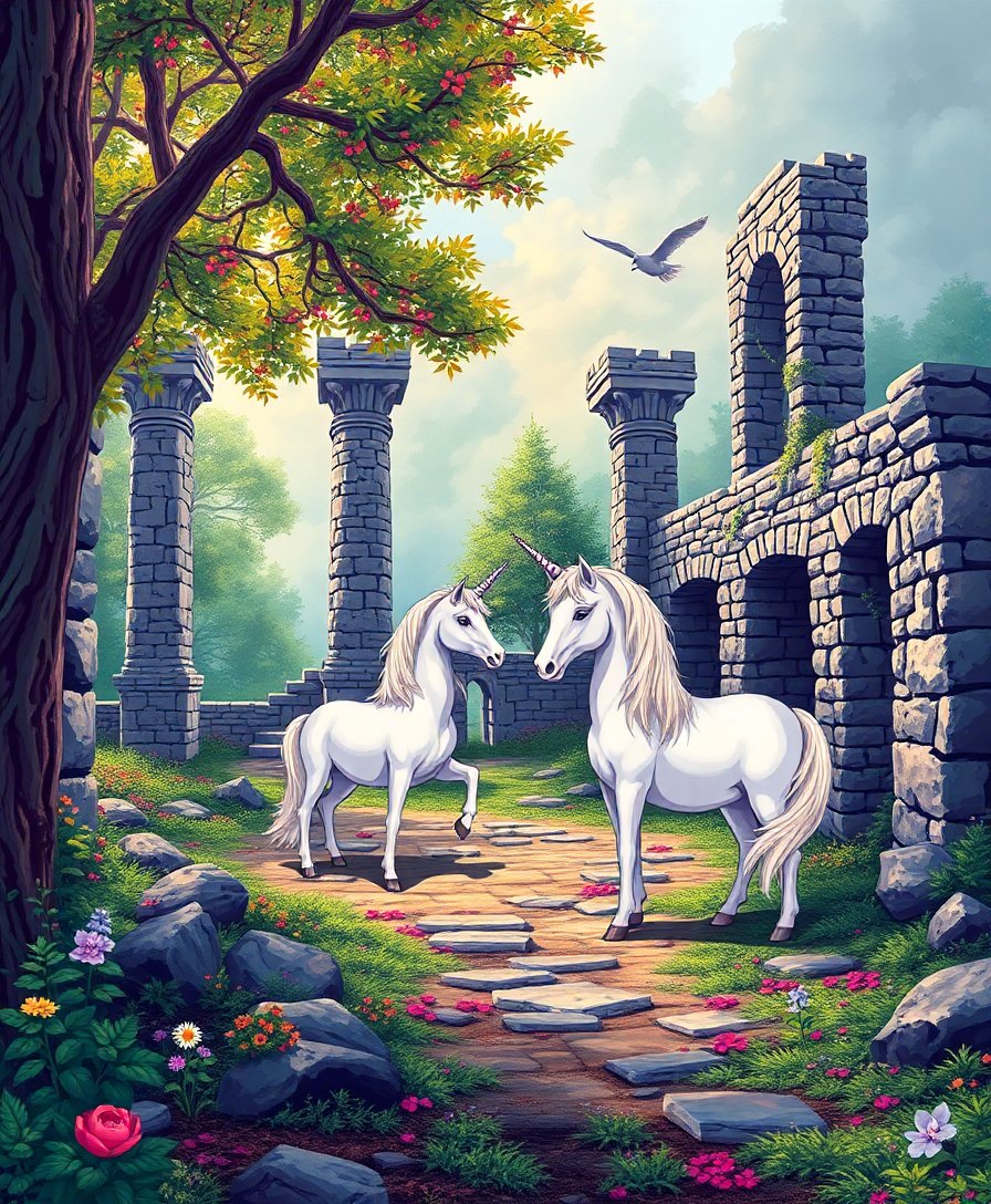 Transform your space with the enchanting Unicorns Amidst Realistic Ruins Paint By Numbers kit. This captivating design blends mythical creatures with ancient stone architecture. Moss-covered ruins create a mystical backdrop for majestic unicorns. Additionally, this unique artwork brings magic into any room.