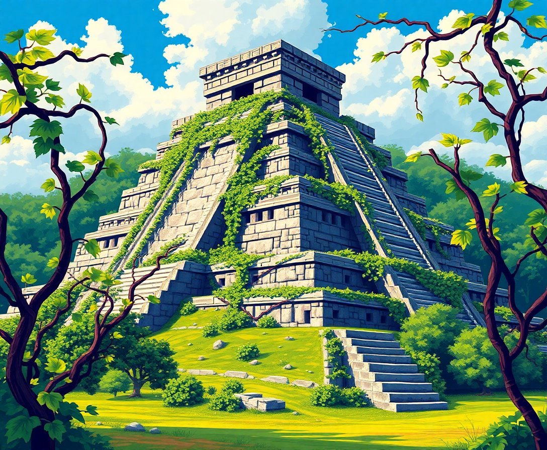 This design uniquely combines archaeological wonder with natural beauty, featuring realistic vines embracing ancient Maya stonework. The intricate details create an immersive experience that’s both educational and artistically rewarding.