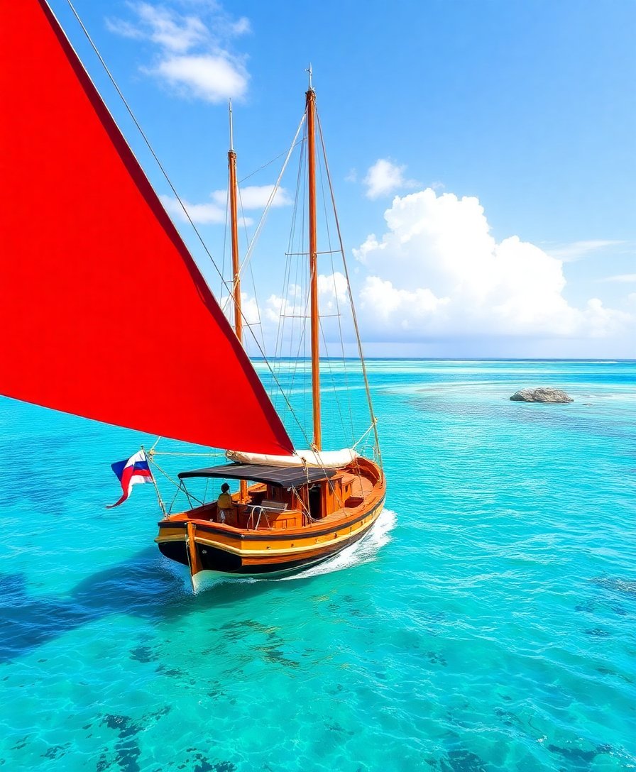 Ultimately, add final details to complete your vintage schooner scene. Therefore, your finished artwork showcases the serene beauty of Pacific island exploration.