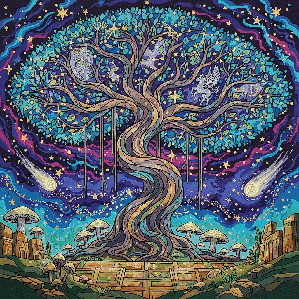 Ultimately, witness your completed constellation artwork emerge. The ancient banyan tree intertwines with stellar patterns beautifully. Your finished piece radiates celestial energy and artistic accomplishment.